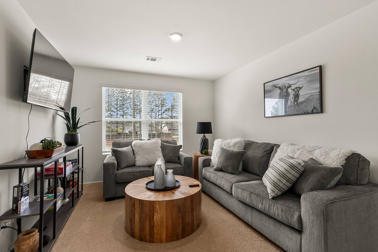 The Space: This luxurious home sleeps up to 10 guests, with plenty of room for everyone to unwind and relax in style: 5 Spacious Bedrooms – A perfect mix of comfort and convenience: o 1 Downstairs Bedroom with a cozy queen-size bed, ideal for a peaceful retreat o Large Primary Bedroom upstairs, your own private sanctuary o 3 Additional Upscale Bedrooms upstairs, including: 2 rooms with comfy twin beds, perfect for kids or friends 1 room with a queen-size bed for ultimate comfort 3 Full Bathrooms – No waiting around! o 1 Downstairs and 2 Upstairs (including an en-suite for the primary bedroom) Living & Dining Areas: • Open-concept living space with soaring vaulted ceilings and large windows that flood the home with natural light • Relax and unwind in the oversized living room featuring a huge sectional sofa, perfect for binge-watching your favorite shows or enjoying family movie night • Upstairs Game Room – Keep everyone entertained with games and fun activities, creating memories to last a lifetime • Dining for 10 – Gather around the elegant dining table for a meal together, whether it's a casual breakfast or a special dinner Kitchen & Outdoor Enjoyment: • Fully-equipped Gourmet Kitchen – Cook up a storm with all the tools and space you need to prepare your favorite meals • Outdoor Oasis – Step outside to your private backyard featuring comfortable seating and a BBQ grill, perfect for evening relaxation or a weekend cookout Extra Perks: • Separate Office Space – Need to catch up on work or emails? This dedicated office space downstairs is ideal for a quiet, productive escape • Garage Access – Parking or extra storage for convenience Prime Location: • 7 miles from the University of Alabama and downtown Tuscaloosa – Perfect for game day, campus visits, or exploring the city • Nearby Park for Kids – Just a short walk away, offering a perfect spot for kids to play while adults relax This isn’t just a place to stay; it’s the perfect home base for making memories, exploring the area, and truly relaxing in comfort and style. Book now and make this beautiful home yours for your next Tuscaloosa adventure!