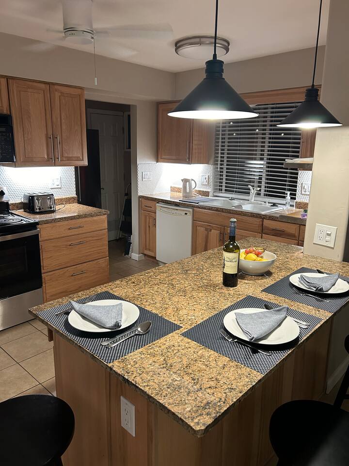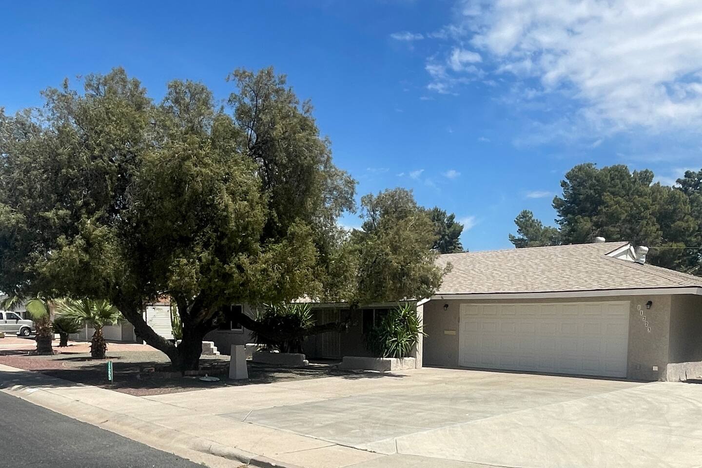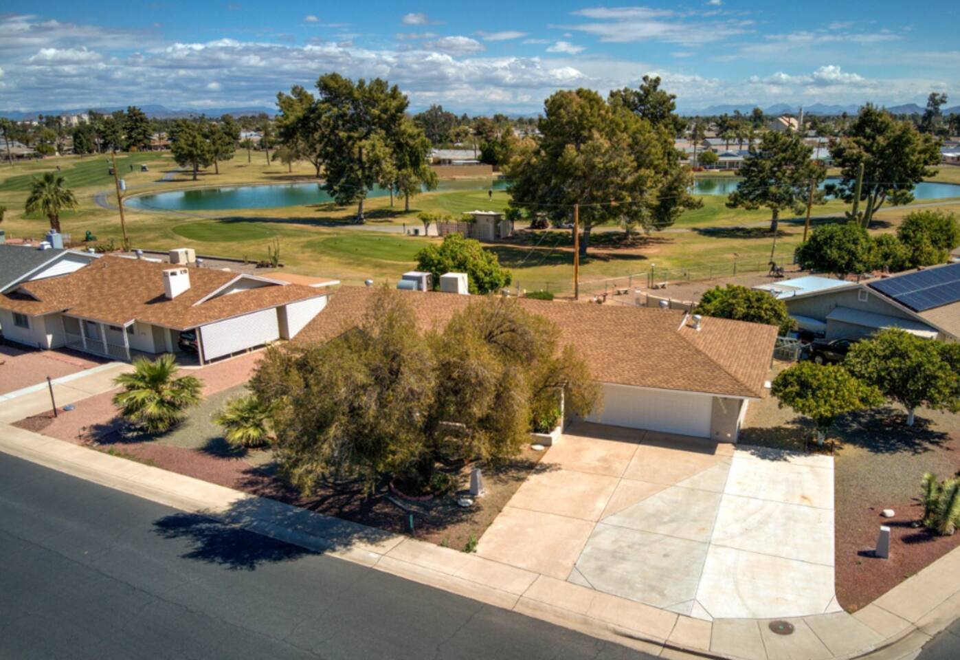 Only 12 minutes from State Farm Stadium & 15 minutes from P-83, this charming 3-bedroom, 2-bathroom home on Sun City South golf course, offers a perfect blend of comfort and elegance. The open floor plan is filled with natural light throughout the day. The kitchen features a large island perfect for hosting guests. Enjoy outdoor living on the covered patio, which opens directly onto the lush golf course. Perfect for out-of-town renters looking for a peaceful retreat in a vibrant community.